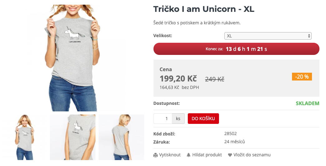 Toto rozšíření vám dovolí pro produkty, které jsou v akci s nastavenou dobou platnosti, zobrazit odpočet času, který zbývá do skončení akce. Podvědomě tak nutíte zákazníka k tomu, aby produkt koupil. Zvyšujete tím naději na konverzi. V nastavení si můžete si změnit text, který se zobrazuje před odpočtem a také vybrat barvu podbarvení odpočtu.