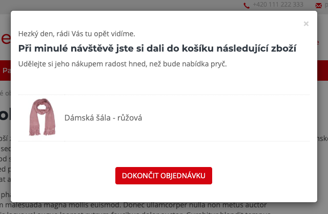 Připomenutí košíku je nové rozšíření, pomocí kterého si můžete zapnout vyskakovací okno, které upozorní zákazníka na zboží, které je v košíku od minulé návštěvy. Pokud se zákazník vrátí na váš e-shop následující den nebo později, tak mu vyskočí okno, které jej upozorní na produkty, které má v košíku. V nastavení si můžete upravit text, který se ve vyskakovacím okně zobrazuje.